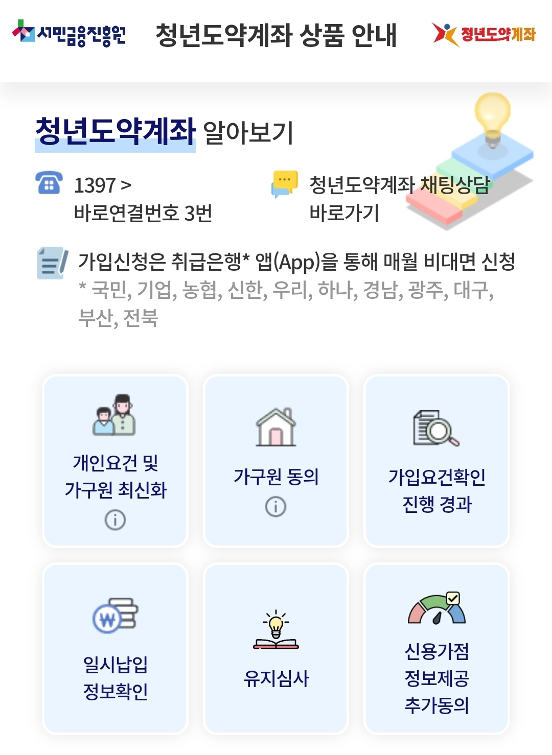 신청 중 궁금한 점이 있다면, 아래 링크를 통해 실시간 채팅상담을 받아보세요. 청년 대상 계좌 정보부터 우대조건 확인까지 도와줍니다.